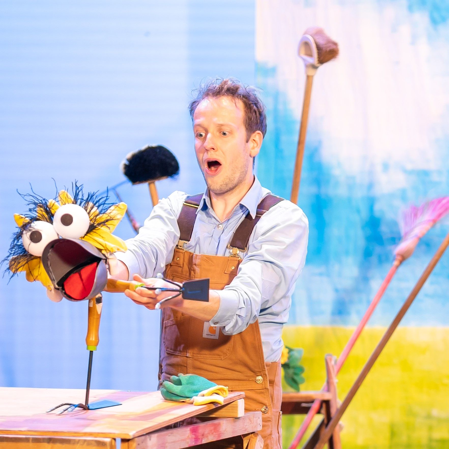 Vlieg eens vlug is een beeldende voorstelling vol poppen en slapstick voor iedereen vanaf 2 jaar. Tuingereedschap komt tot leven en verandert voor je ogen in tuindieren. Samen met de kinderen dansen, zingen en moedigen we de tuinman aan om meer te kunnen dan hij ooit had durven dromen.