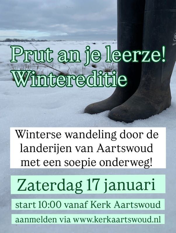 We starten om 10.00 uur bij de kerk Aartswoud, Schoolstraat 45. De route is minimaal 8 kilometer. Zorg zelf voor stevige waterdichte schoenen/ laarzen. Wij zorgen voor een heerlijke warme kop soep.