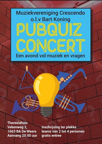 Op zaterdag 7 maart organiseert Crescendo een pubquiz-concert. Een avond vol met muziek en aansluitend vragen.